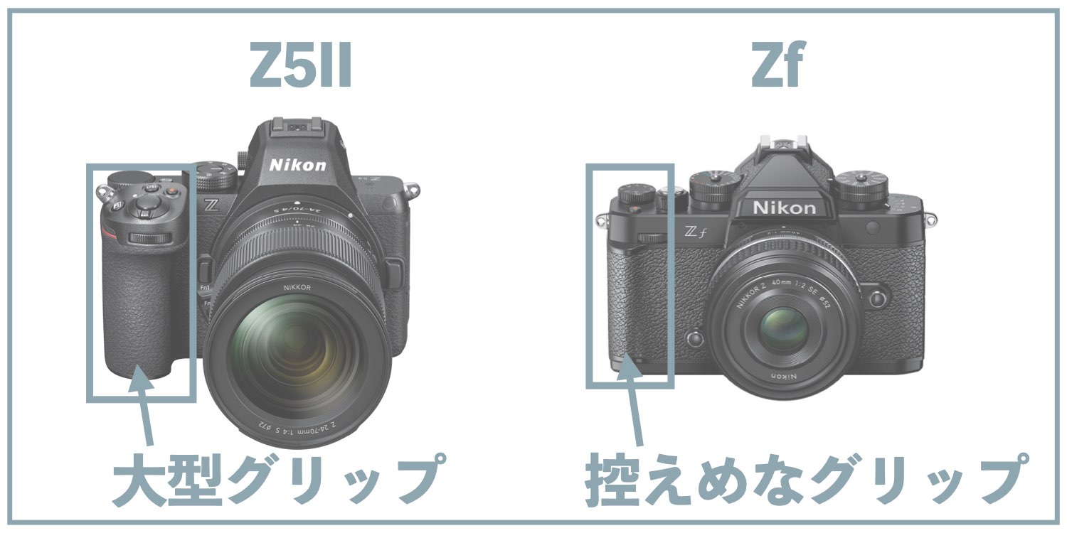 望遠レンズを多用する方、大きなレンズを使用する方は、しっかりしたグリップがあるZ5IIがオススメです。